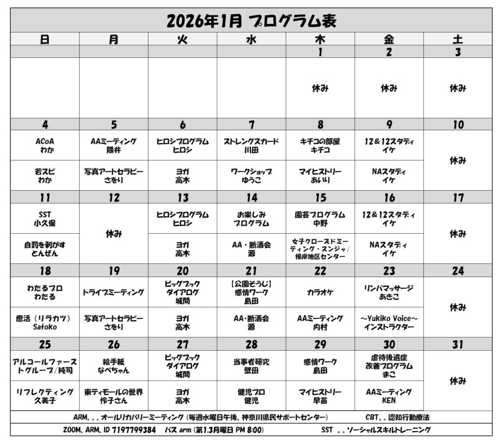 2026年1月のプログラム 2025年12月24日2025年12月24日misawa 2026年1月のプログラムです。 詳しい内容や利用方法などは、YRCまでお問い合わせください。TEL:045-353-9130 印刷用(PDFファイル)は、こちら